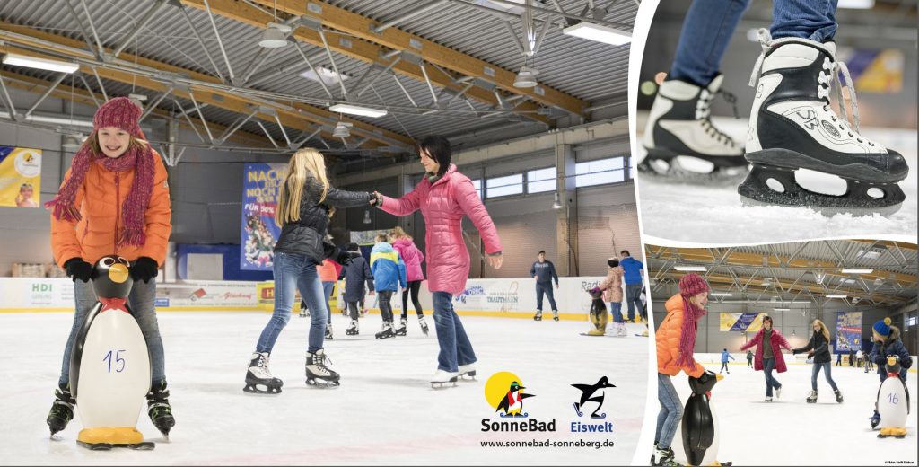Im Eisstadion des SonneBads Sonneberg kann man sich jährlich von Anfang Oktober bis Ende März auf´s Glatteis begeben. Die Einrichtung bietet für Jung & Alt eine große Palette an Eisvergnügen. Egal ob Familienausflug, Trainingslager oder Eislaufkurs – hier kommt jeder auf seine Kosten.Neben heißen Getränken und kleinen Snacks stehen Eislauf-Lernhilfen und natürlich die Ausleihe von Schlittschuhen zur Verfügung.